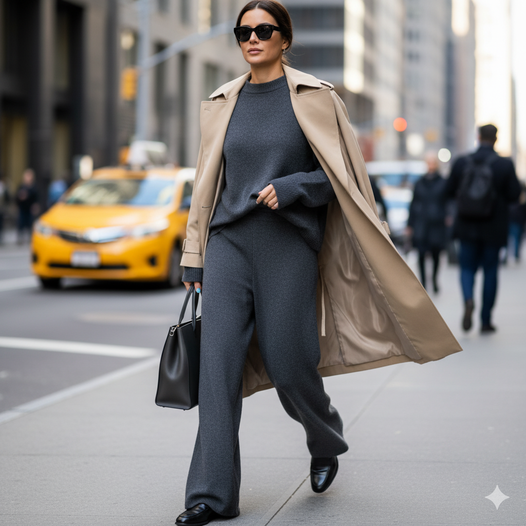 👍 추천 컬러: 차콜 그레이 셋업 + 베이지 트렌치코트 또는 블랙 셋업 + 체크 패턴 블레이저.