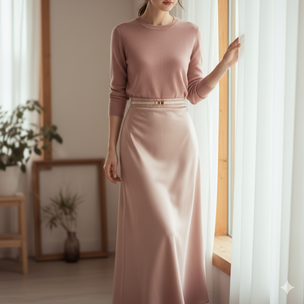 3. ✅ 공식 3: '얇은 니트 + 새틴/플리츠 스커트'로 페미닌 무드 완성