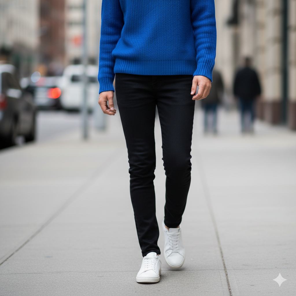 🔹 스타일링 팁: 상의에 포인트를 줬다면, 하의와 신발은 최대한 심플한 것으로 골라주세요. 예를 들어, 채도가 높은 비비드 블루 니트를 입었다면, 하의는 중립적인 블랙이나 진한 데님을 선택하여 시선이 니트에 집중되도록 만드는 것이 중요합니다.