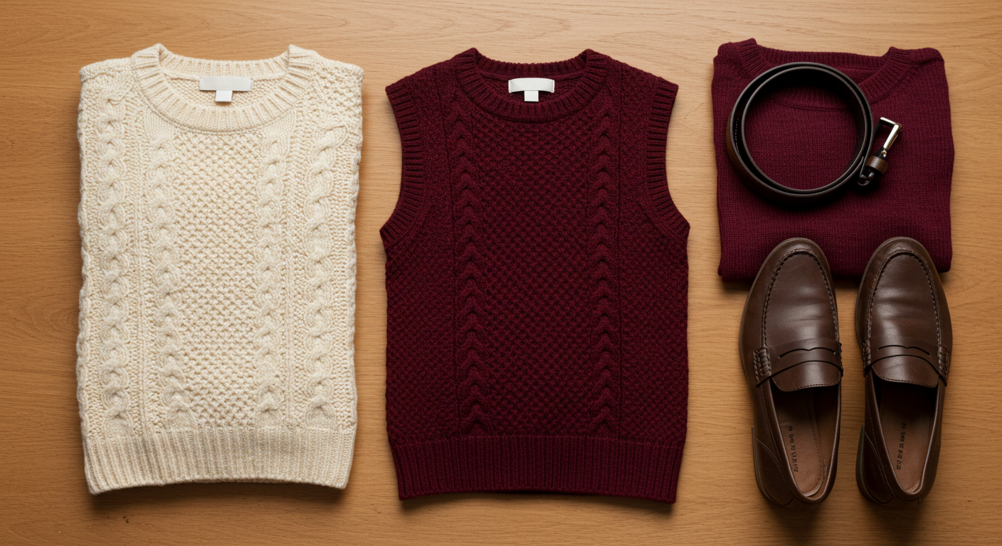 밋밋한 룩에 포인트를 주면서도 지적인 분위기를 연출할 수 있는 '꾸꾸꾸' 스타일의 대표주자입니다. 니트 베스트(조끼)를 활용한 레이어드 룩은 2025년에도 변함없이 트렌드예요.