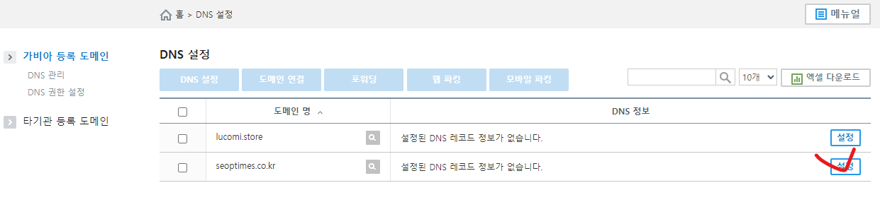 가비아 사이트에 로그인하고, My 가비아로 가서 DNS 관리를 클릭합니다. 그 후, 구매한 도메인 옆에 있는 설정 버튼을 클릭하세요.